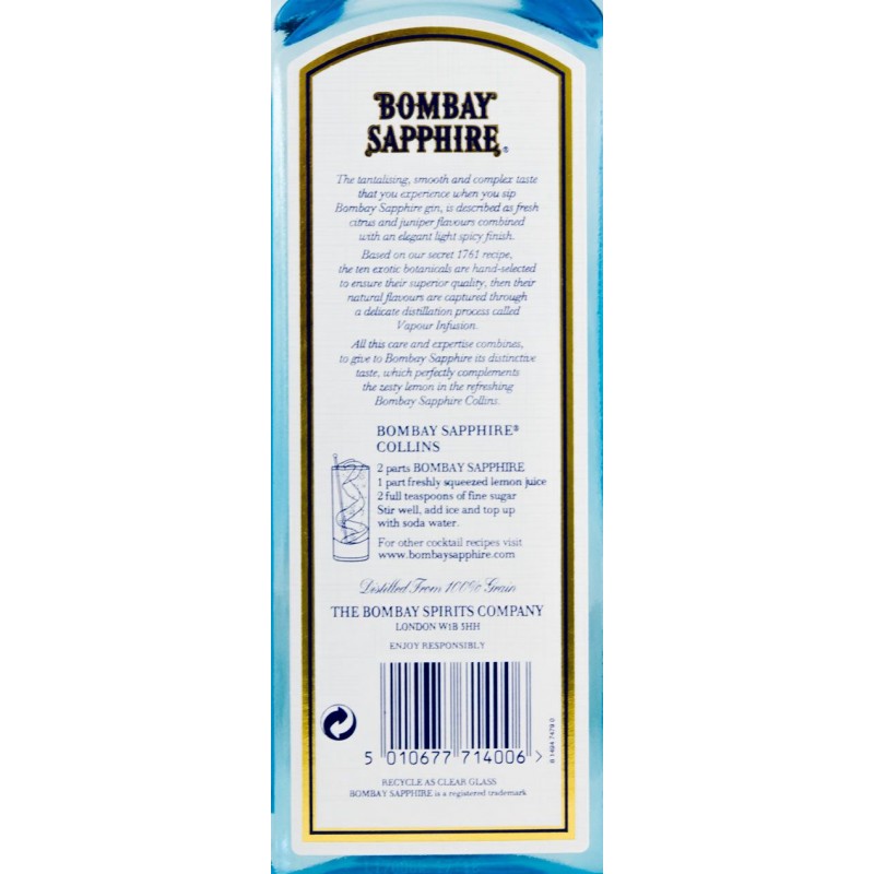 Considerado como um dos melhores gin do mundo, o Bombay Sapphire conquistou os apreciadores da bebida, símbolo de Inglaterra, não somente pela sua qualidade e sabor excecionalmente equilibrado, mas também pela linda garrafa azul e brilhante com a cor de uma safira. Triplamente destilado e criado a partir de uma receita secreta de 1761, onde são apenas utilizados ingredientes de alta qualidade. São utilizadas 10 diferentes plantas na sua produção, que estão gravadas na lateral de cada garrafa: a casca de amêndoas espanholas, limão, alcaçuz, bagas de zimbro, raiz de lírio, angélica, coentro, cássia, cúbeba e grãos do paraíso, que criam um aroma e sabor único.