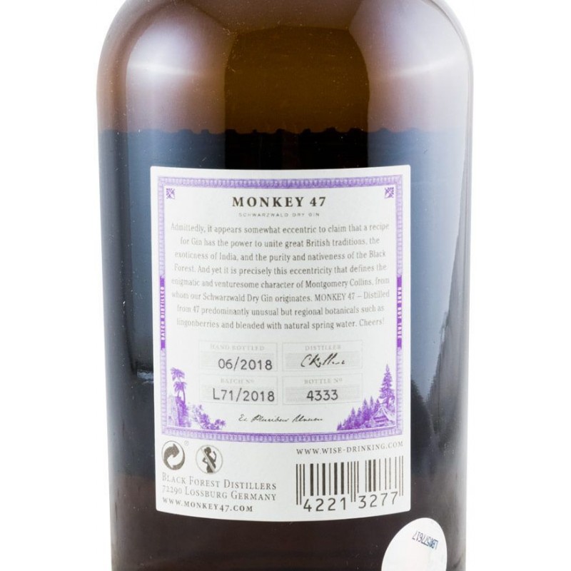 A receita de Monkey 47 envolve a colheita de 47 botânicos originários da Floresta Negra, cuidadosamente selecionados e destilados artesanalmente, produzindo um gin de pequenos lotes, engarrafados e rotulados à mão. Este gin é uma edição limitada sempre que é produzido.
