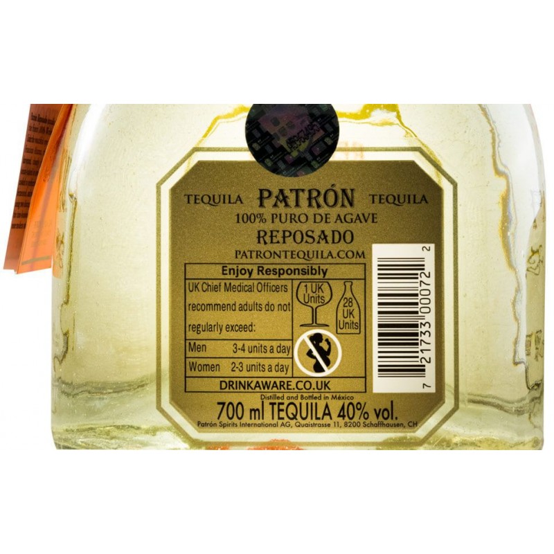 Patron Reposado é uma opção agradável para os apreciadores de tequila que apreciam complexidade e suavidade do sabor. Estagiou em barricas de carvalho durante mais de dois meses, é a combinação perfeita do paladar fresco e limpo de Patron Silver com o sabor de carvalho de Patron Añejo. Sabor de agave fresco e madeira de carvalho com notas cítricas, fruta e mel torna esta tequila muito especial. Uma excelente opção para beber puro ou para fazer parte de um cocktail de qualidade. Tal como os seus homólogos (outro Patron), cada garrafa de Patron Reposado é única, feito de vidro reciclado e numerada a mão.