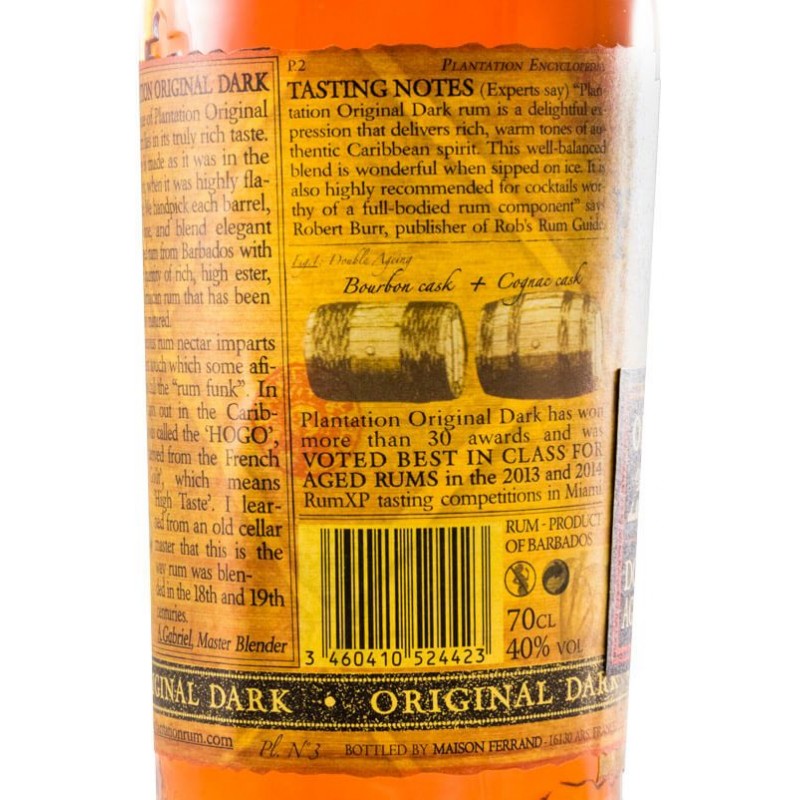 Plantation Original Dark apresenta o estilo rico e intenso da Jamaica e dos Barbados com notas de ameixa, banana e baunilha, realçadas por uma mistura cuidadosa e um envelhecimento adicional em França. O resultado é uma estrutura profunda, temperada com notas de canela e cravinho.